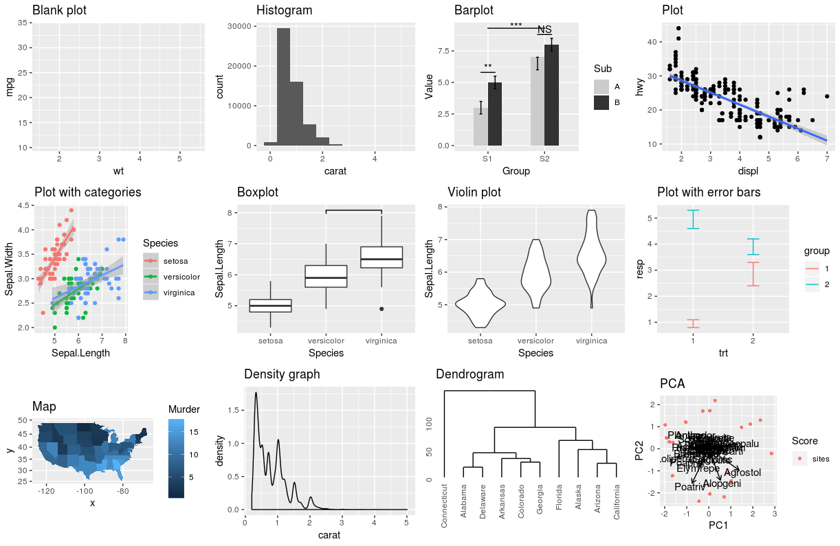 geoms is the abbreviation for geometric objects which are used to specify which type of graphic you want to produce (boxplot, barplot, scatterplot, histogram, …). All ggplot2 geoms start with the geom_ prefix.