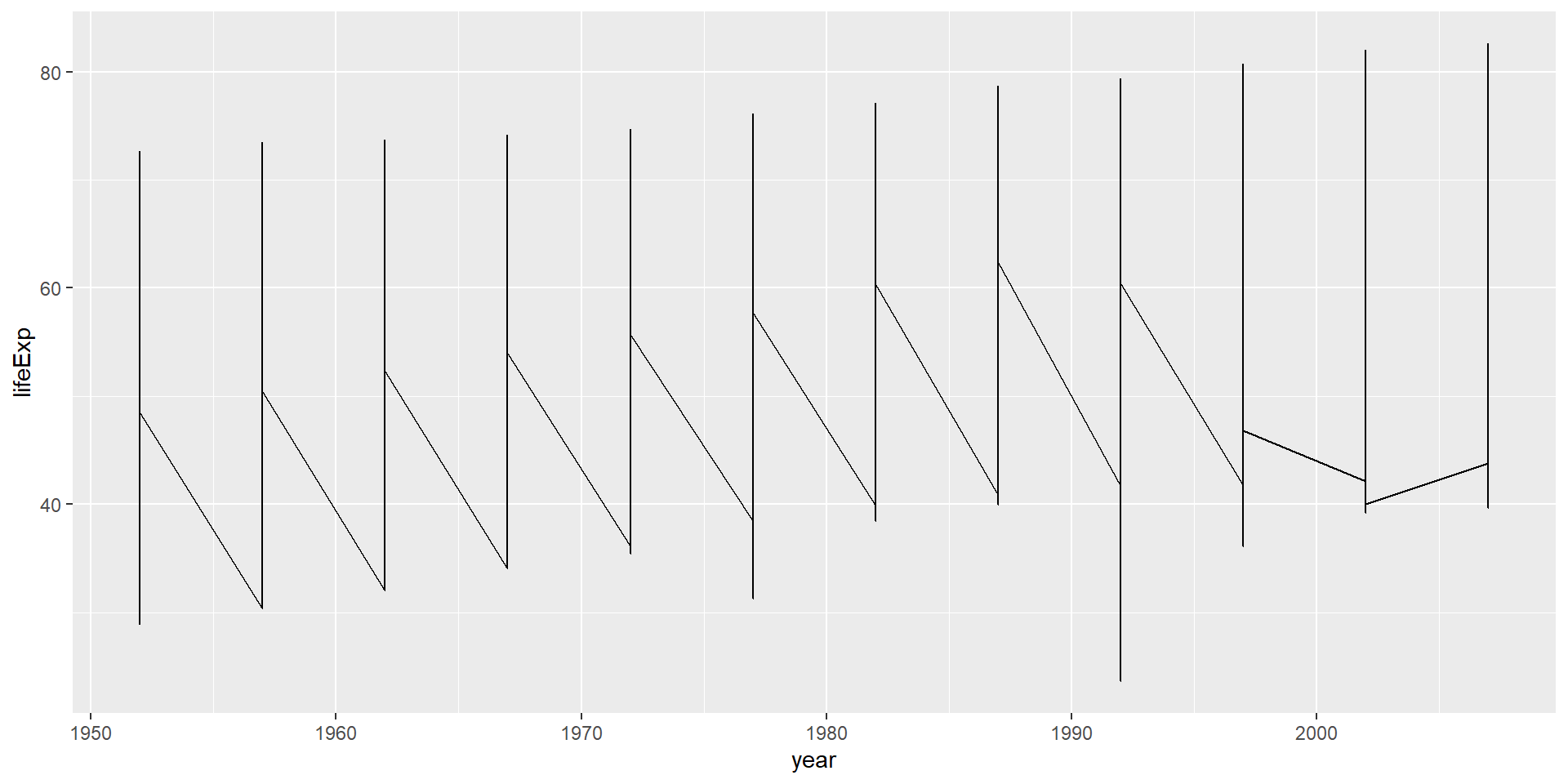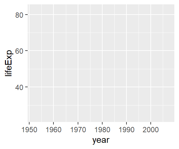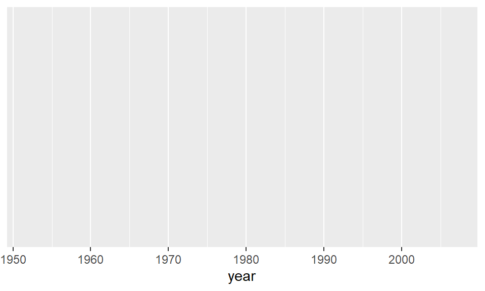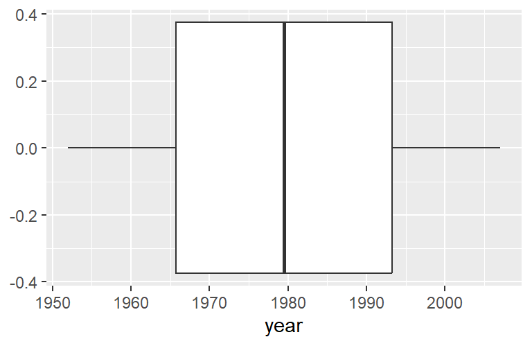 ggplot(data = gapminder,mapping =aes(x = year)) +geom_boxplot() # No `y` mapping needed for boxplot