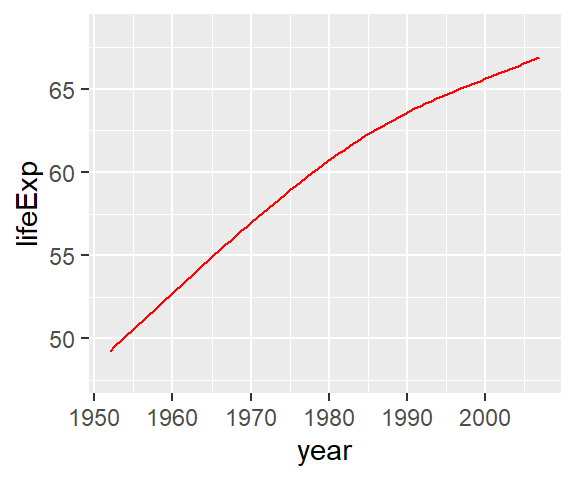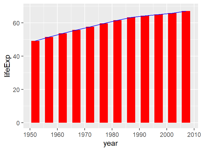 ggplot(data = gapminder,mapping =aes(x = year,y = lifeExp)) +geom_bar(stat ="summary", width =3, fill ="red") +# adding bar graphgeom_line(stat ="summary", color ="blue") # adding line graph