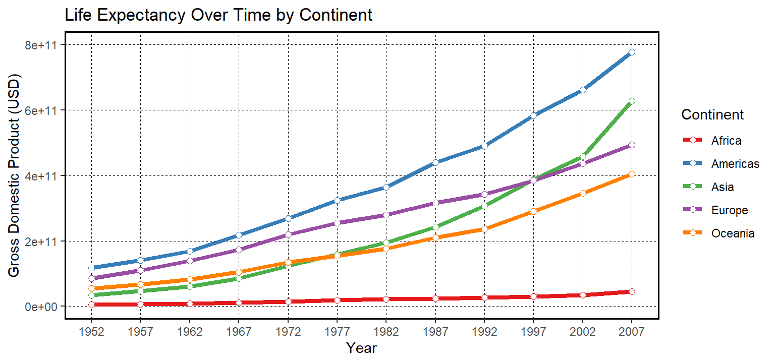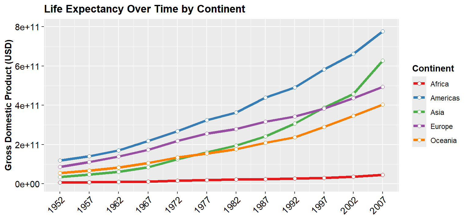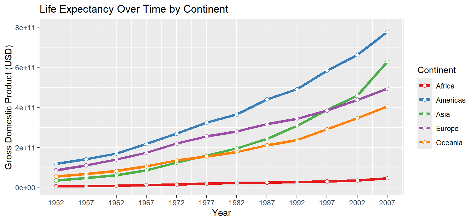 ggplot(data = gapminder,mapping =aes(x = year, y = gdpPercap * pop, color = continent)) +geom_line(stat ="summary", size =1.5) +geom_point(stat ="summary", shape =21, fill ="white", size =2) +scale_x_continuous(name ="Year", breaks =unique(gapminder$year)) +scale_y_continuous(name ="Gross Domestic Product (USD)") +scale_color_brewer(palette ="Set1") +ggtitle("Life Expectancy Over Time by Continent")