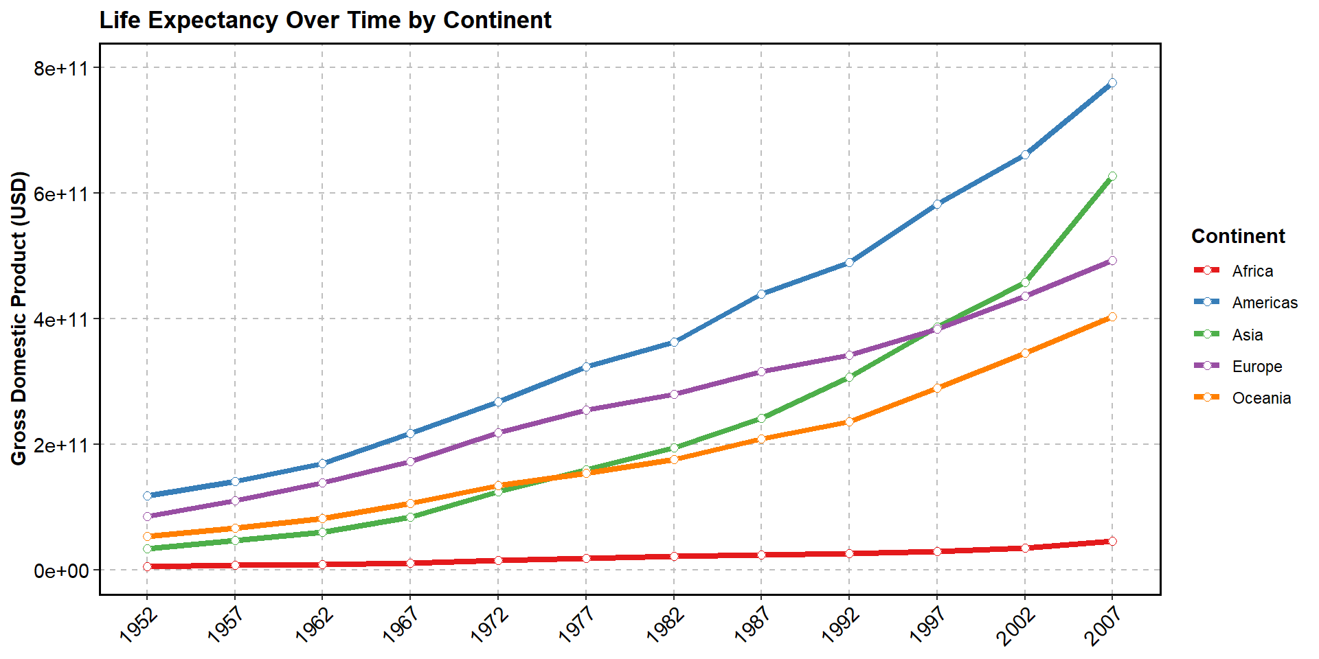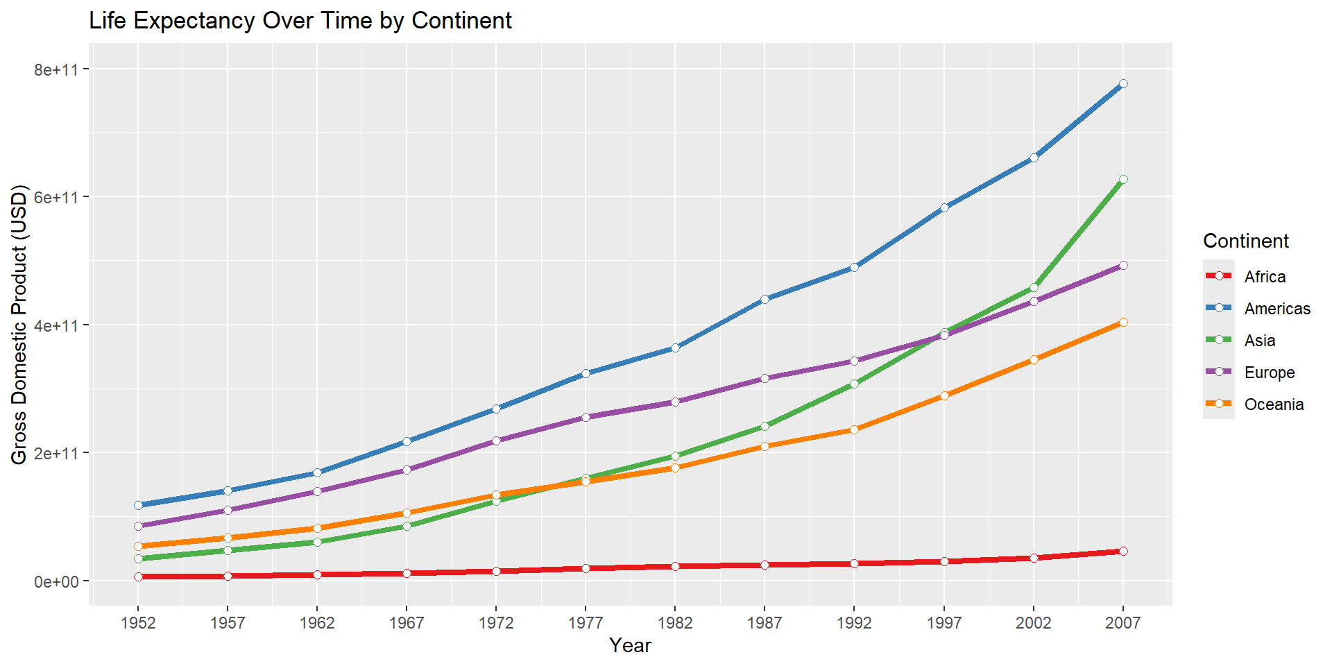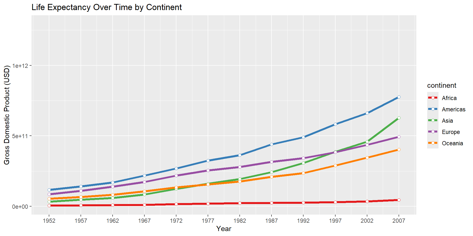 ggplot(data = gapminder,mapping =aes(x = year, y = gdpPercap * pop, color = continent)) +geom_line(stat ="summary", size =1.5) +geom_point(stat ="summary", shape =21, fill ="white", size =2) +scale_x_continuous(name ="Year", breaks =unique(gapminder$year)) +scale_y_continuous(name ="Gross Domestic Product (USD)") +scale_color_brewer(palette ="Set1") +ggtitle("Life Expectancy Over Time by Continent")