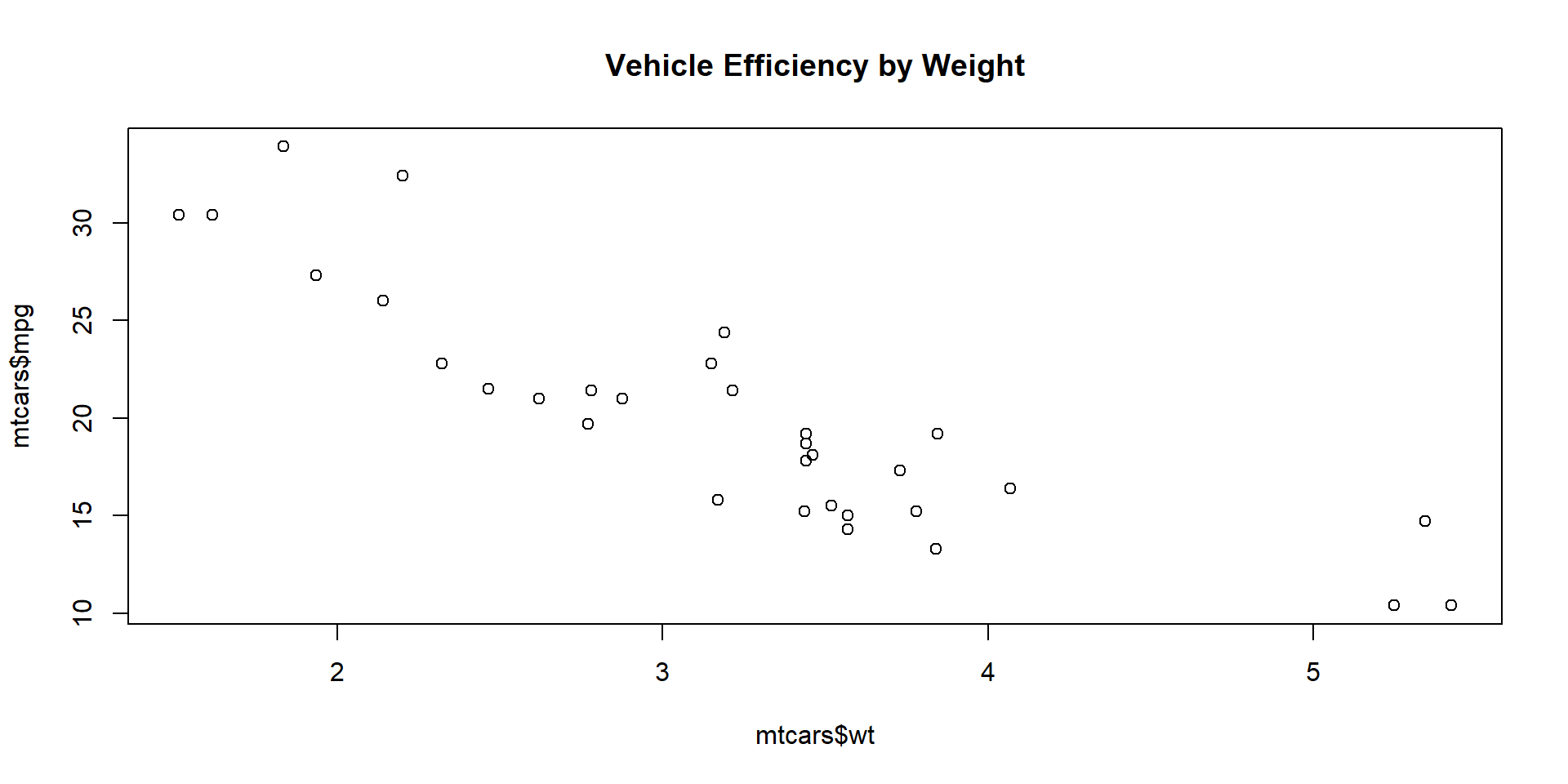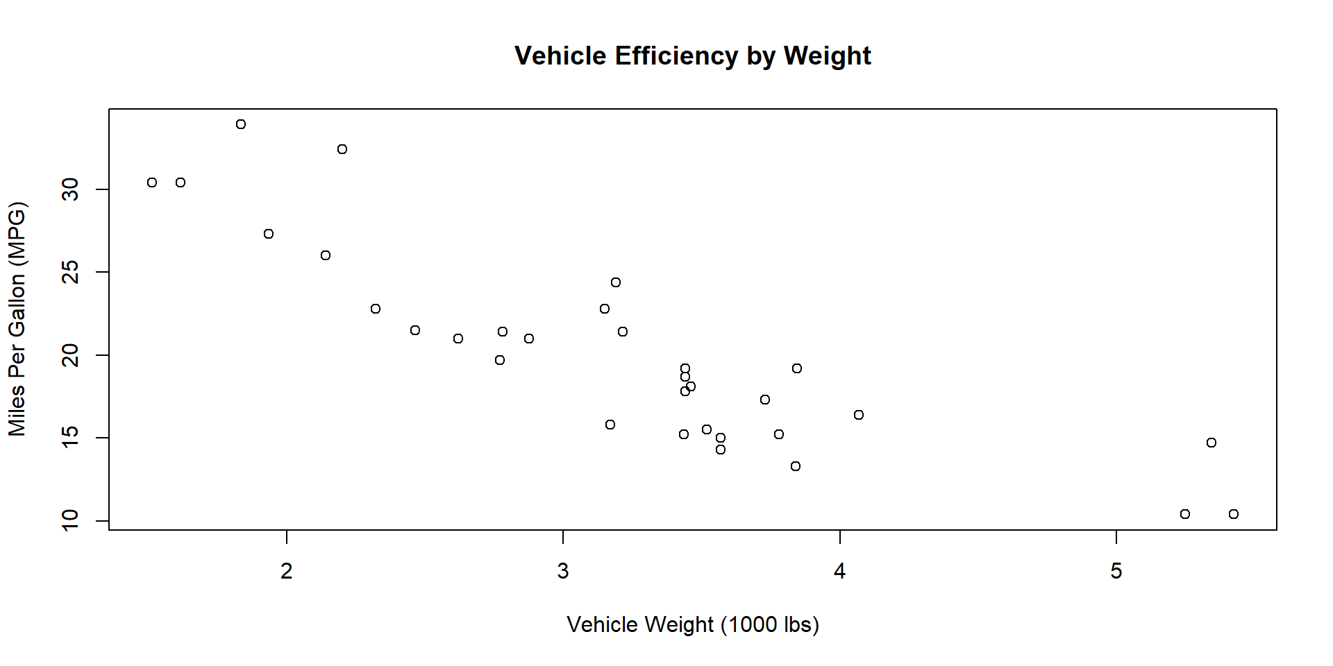 plot(x = mtcars$wt, y = mtcars$mpg,main ="Vehicle Efficiency by Weight",xlab ="Vehicle Weight (1000 lbs)", #<< adding x-axisylab ="Miles Per Gallon (MPG)") #<< adding y-axis
