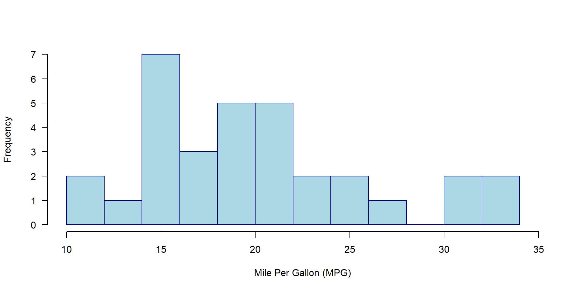 hist(x = mtcars$mpg, # data to plotbreaks =15, # change default number of barsxlim =c(10, 35), # change size of x-axismain ="", # no main titlexlab ="Mile Per Gallon (MPG)", # x-axis titlelas =1, # y-axis ticks horizontalborder ="darkblue", # bar border colorcol ="lightblue") # bar fill color